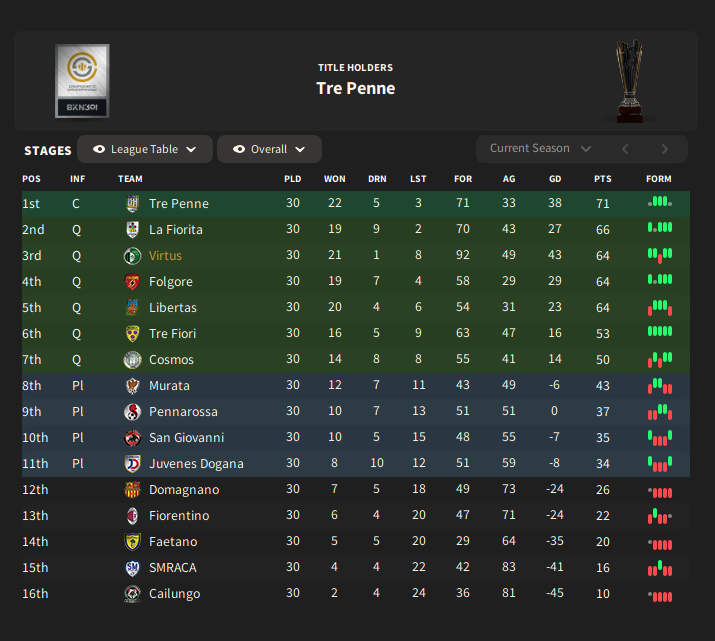 With 6 games remaining, the task was simple: win them all. Knowing if they won all their games, Virtus would be in control of their own destiny, but they let that slip with a narrow 1-0 defeat away to Tre Penne. That result gave the power over the reigning champions, and it would prove to be costly along with a defeat to Folgore. Those two defeats were the difference between the 3rd place finish Virtus settled for and the league title.
