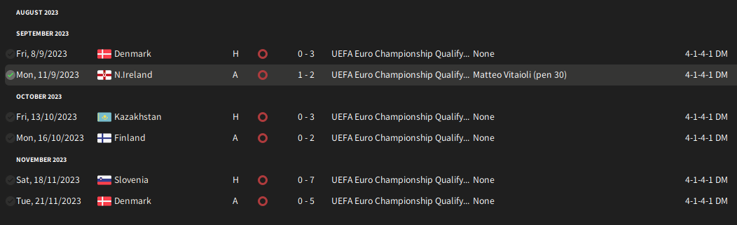 Without really knowing his national pool of players yet, Selva elected to park the bus against the Finnish, and despite recording a respectable 2-0 defeat, he was concerned and the severe lack of chances. With that in mind, he opted to go a bit bigger and bolder against the Slovenians, but that massively backfired on him as they slumped to a 6-1 defeat. Selva was quite glad these games were over, as the next international break was in September, giving him time to assess the options.