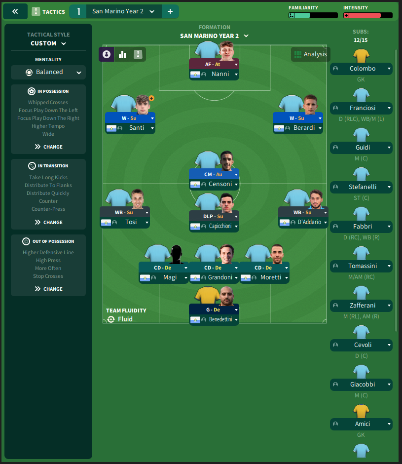 The idea being that both the left and right WB can support the SM and wingers effectively enough, whilst providing defensive cover was massive for Selva. A body sat in front of the defence makes going through the middle of the team difficult but offers a threat when on the counter-attack with passes from deep. Both wingers are tasked with supporting the striker and Selva thinks with time this could be the short-term answer to his problems. This opinion was based on a narrow 2-1 defeat to Somali, where San Marino actually carried a threat in the attack.