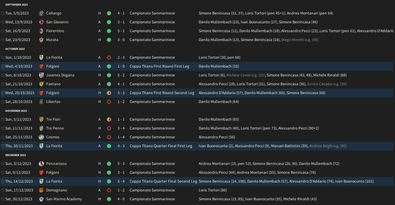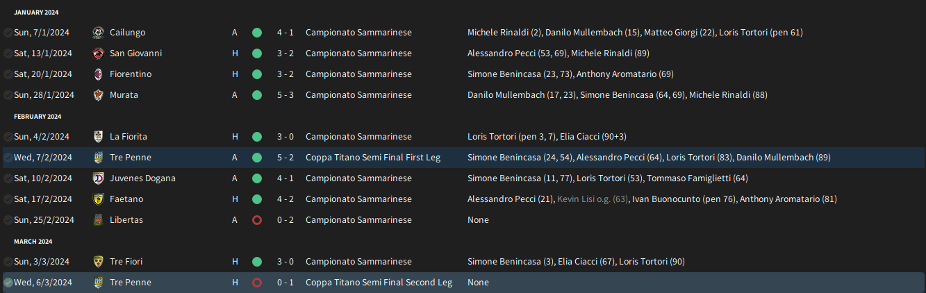 9 further players arrived in January, whilst a further 2 left the club. The biggest signings of this window were Canadian Anthony Aromatario from Tre Friori; he would go on to claim the CM spot in the side despite his young age. Sammarinese CM Matteo Giorgi also joined the club – Selva attempted to sign him in the summer, but his demands at the time were unrealistic, Selva was willing to compromise this time around.