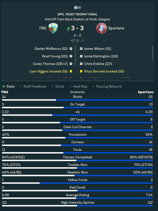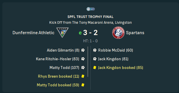 I know what you’re thinking, surely you got revenge in the SPFL Trust Trophy in season 2? No. More heartbreak. This time, we fall to defeat in extra time having absolutely dominated the game. Fuming.