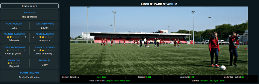 As you’ll see, this really is going to be a challenge to get the club from League Two, all the way to the top flight. The facilities and reputation could certainly be better but at the same time they could also be worse. It is a base from which we can start and build our way up. We will be playing our trade at Ainslie Park Stadium which in truth looks very decent for this level of football.