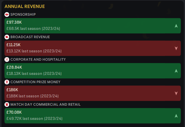 As you would expect, most things are in the green following the conclusion of the 2024/2025 season. Our attendances were up to the 1,500 mark and our reputation growth has no doubt assisted. Competition money isn’t far off Season One but we did have a slightly worse season in terms of domestic competitions so it was to be expected.