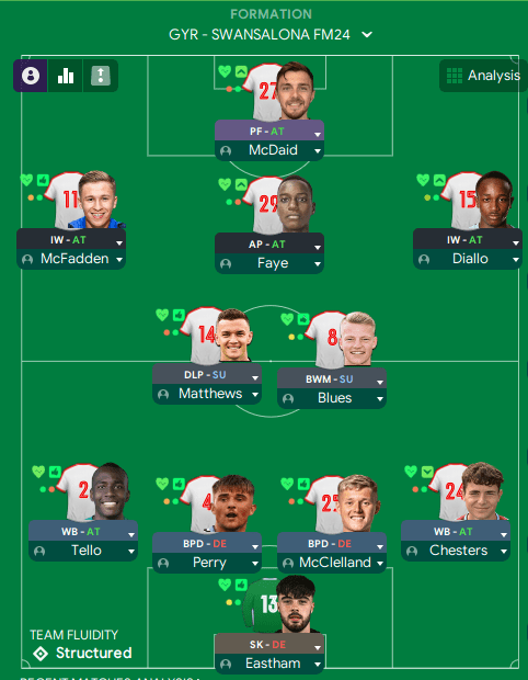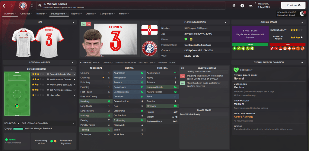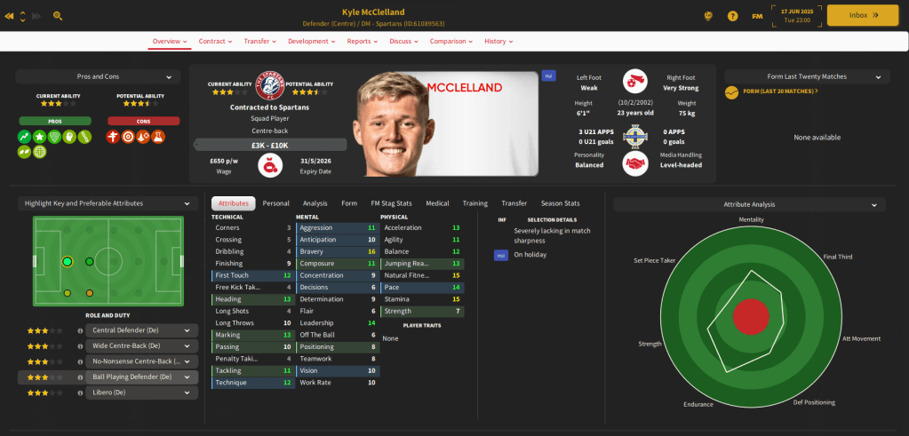 No less than seven new defenders joined the club over the summer. With Jack Kingdon returning to his parent club and Rhys Bennett not the most gifted, I knew we needed central defensive reinforcements. In the end, I brought in four new centre backs. Kyle McClelland looks a very well rounded defender and joins from Queen of the South. Michael Forbes arrives from Harvorford West and at 21 could improve a decent amount. Callum Perry arrives on loan from Coventry and his mentals and physicals are just incredible for this level. Finally, Jadel Katongo joins us on a free after being released by Manchester City. Four decent central defenders that really should do the job in this league.