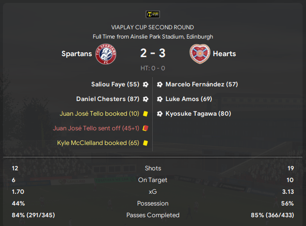 It wasn’t to be for us, sadly. Juan Jose Tello decided he fancied an early bath and left us with ten men for the second half. We responded well by taking the lead on 55 minutes, courtesy of Saliou Faye but we were then outclassed in the final third of the game with Hearts scoring three. A hard one to take but our second half performance was not good enough.