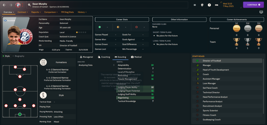 And that is exactly what I did! Please welcome, Sean Murphy who joins the club following his retirement from playing in the Scottish Lowland League. Murphy is a considerable upgrade on my previous Director of Football and he had played a key part over the summer in finding suitable targets to bring in as free transfers.