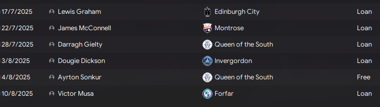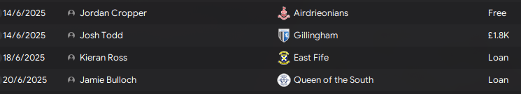 The rest of the outs were loan deals in order to allow some of our younger players to gain valuable experience elsewhere. I have high hopes for James McConnell, who you will see later in this post arrived from Liverpool on a free. It is also satisfying to keep all of the loan players in Scotland which means that they can help improve the teams and leagues around us and start to push the national rankings up.