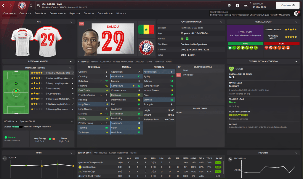 What a season from Saliou Faye. We knew when he joined that he was a talent and he has flourished this season. I’ll admit, it took me a while to find the best role for him but we finally stuck with him in a midfield two playing as an Advanced Playmaker. 10 goals, 9 assists and an average rating of above seven. At 20 years-old I would consider that a very good season.