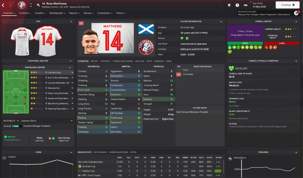 Two further signings bolstered the ranks. Firstly, we brought in a new left back as our Colombian summer signing of Juan Jose Tello left us underwhelmed. We managed to pick up 23 year-old Owen Dodgson on a free transfer after he was released by Burnley. He has a full season of experience in the Scottish Premiership having spent last season at Livingston where he made 34 appearances. Finally, a bit of a ‘one for the future’ in the form of Cole McKinnon. He was released by Rangers and I took a punt on him. He has some very good attributes for this level and if nothing else, he will be a good squad player.