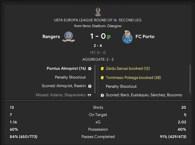 Rangers made it to the Europa League Round of 16 where the fell to FC Porto on penalties. Cruel.