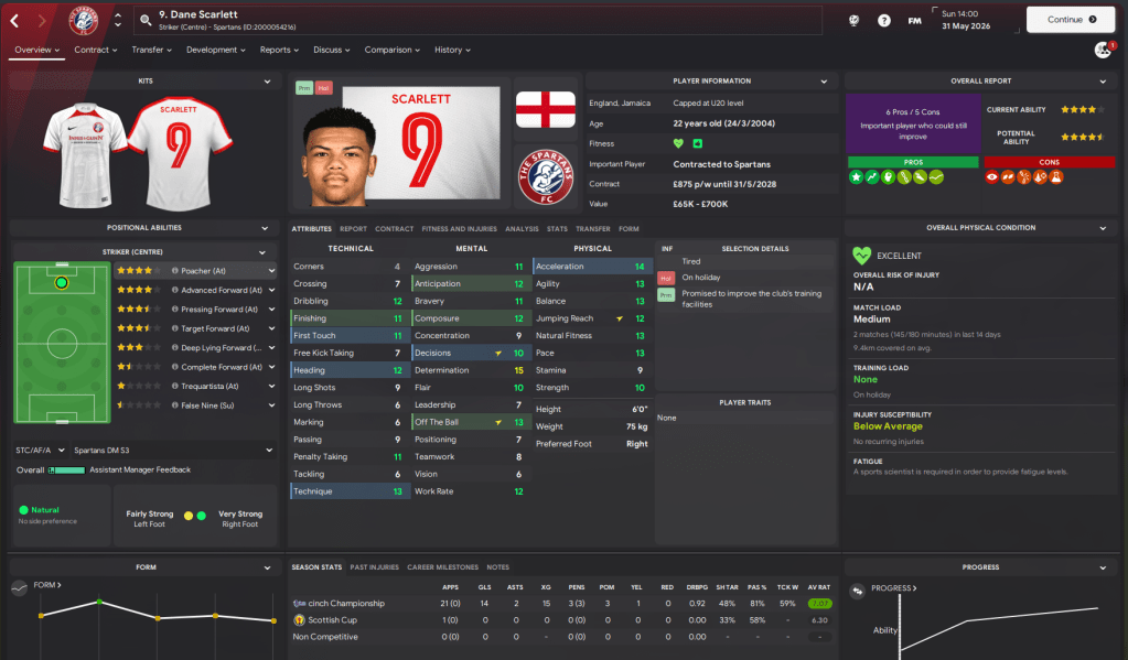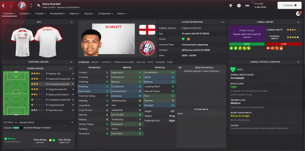 The player in question was Dane Scarlett. Clearly he hasn’t progressed as well as he has done in previous version of the game but he is still a very solid player and one who I think could become a bit of a club legend. His attributes aren’t ‘amazing’ but his determination, pace and decent finishing/composure should see him do well at this level and crucially, develop.