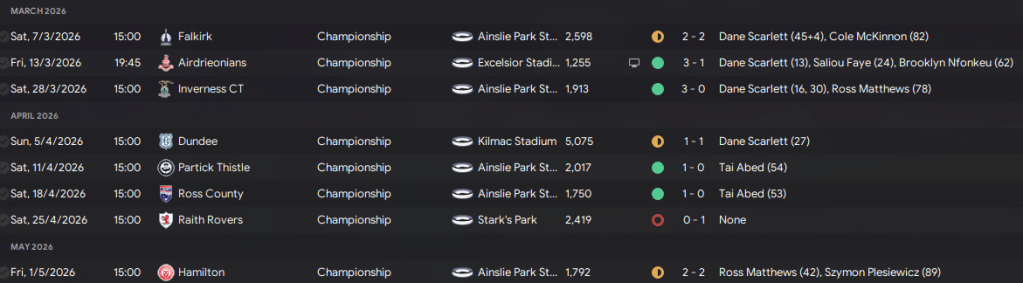 In comparison, February was much improved. A single loss against second placed Ross County and some big wins with two 4-1 wins over Partick Thistle and Hamilton. Crucially, Dane Scarlett started to fire and Saliou Faye playing as an Advanced Playmaker saw his attacking output increase. What a player he is by the way! This run of form left us clinging on to a playoff spot with eight games left to go. We couldn’t, could we?