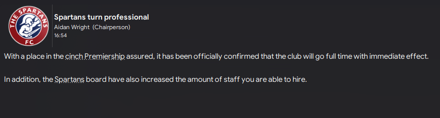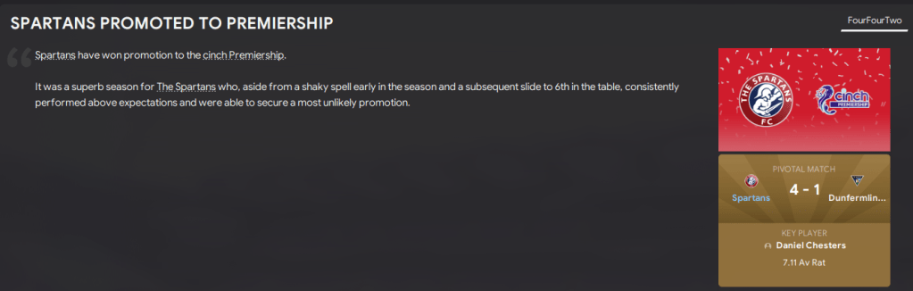 THREE FROM THREE. Spartans are promoted to the Scottish Premiership. An exceptional playoff stage ensured that we sealed our promotion in style. Sadly, FM did not show us lifting any trophy. Darn you SI!!