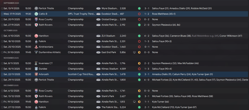 November and December was much improved, with just the one defeat away to Dundee. We picked up some big wins with a 6-0 over Partick Thistle and a 2-1 away win over runaway leaders Falkirk!