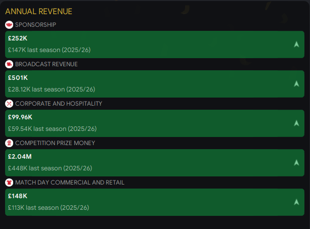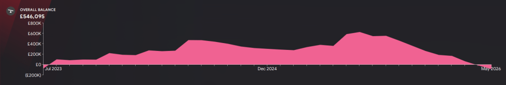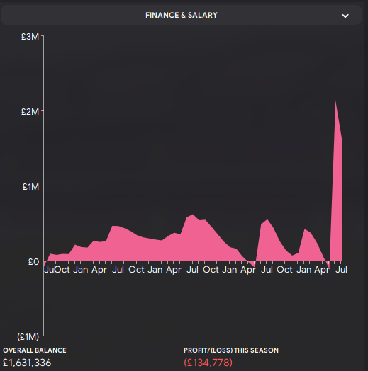 With a very successful season behind us, we see a hugely positive impact on the club’s finances. Prize money was the biggest income with our third placed finish. For the first time in this save, we finally have a financial balance to build from.